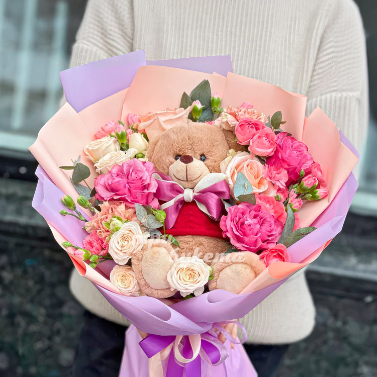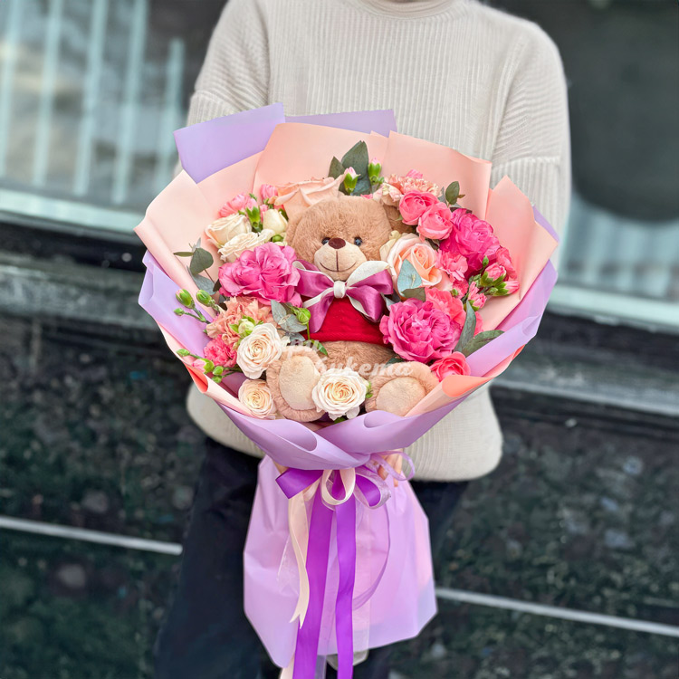 Букет гвоздик и роз с Мишкой на 14 февраля