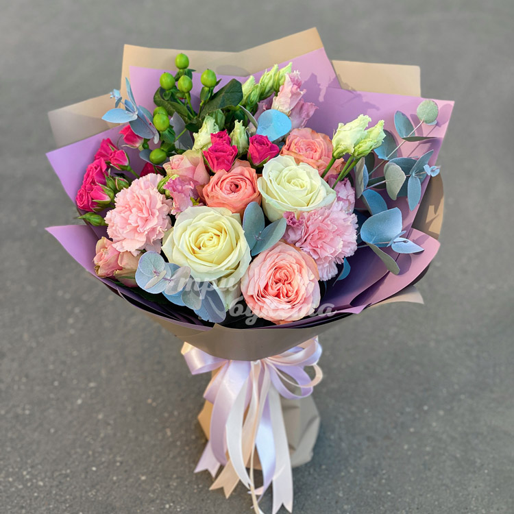 Букет из эустом, гвоздик и роз