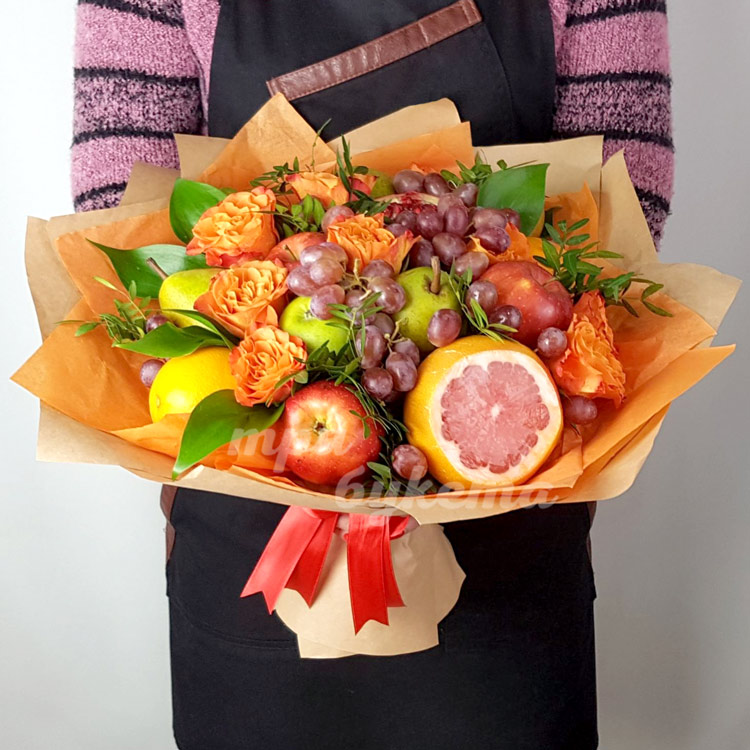 Букет из фруктов и оранжевых роз