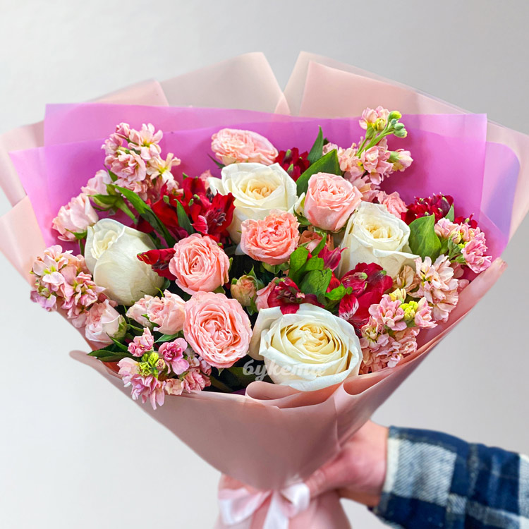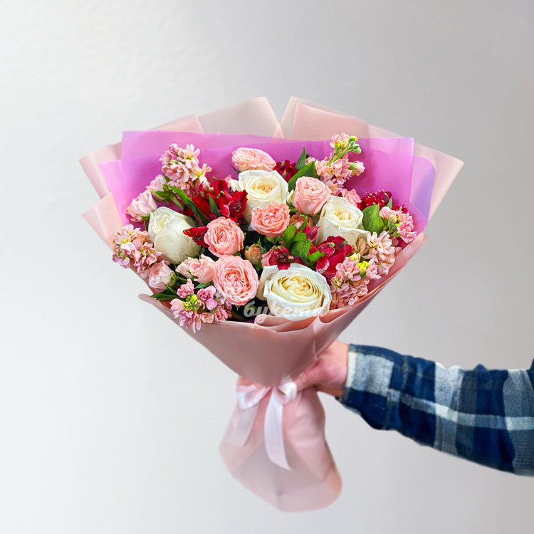 Букет персиковых маттиол и роз на 8 марта