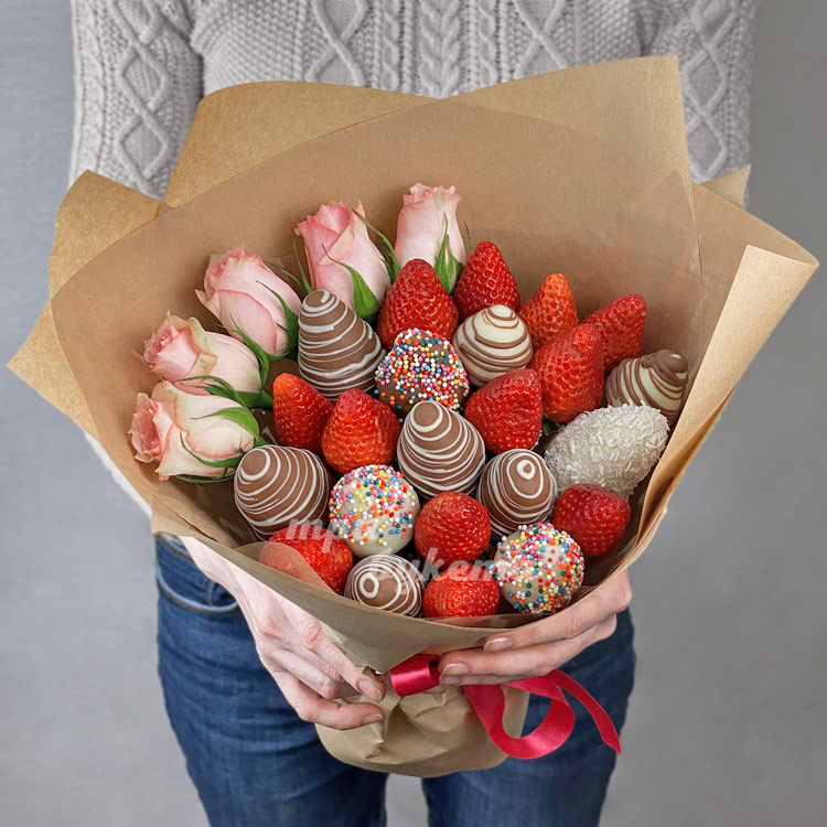 Букет светло-розовых роз и клубники