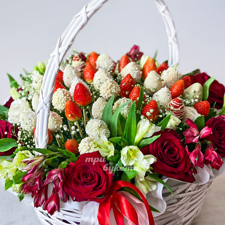 Корзина клубники в шоколаде с цветами