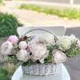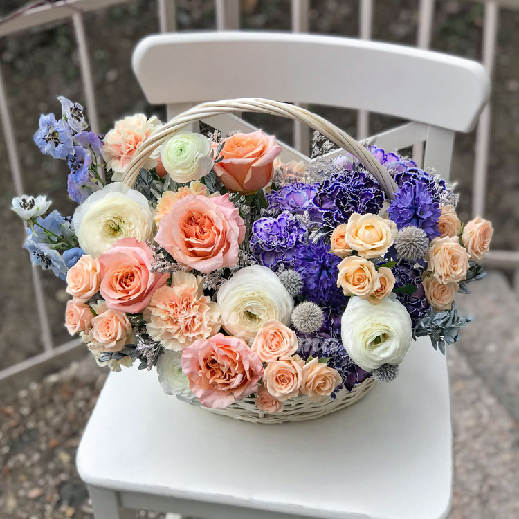 Корзина ранункулюсов, роз и гвоздик