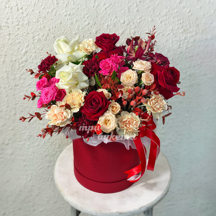 Красная коробка роз, гвоздик и зелени
