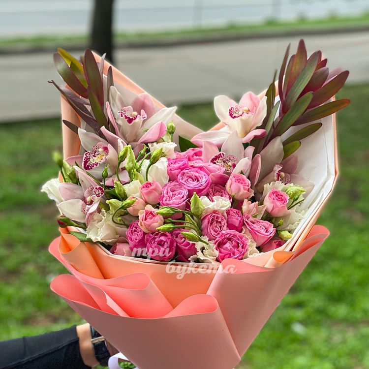 Розовый букет орхидей и пионовидных роз